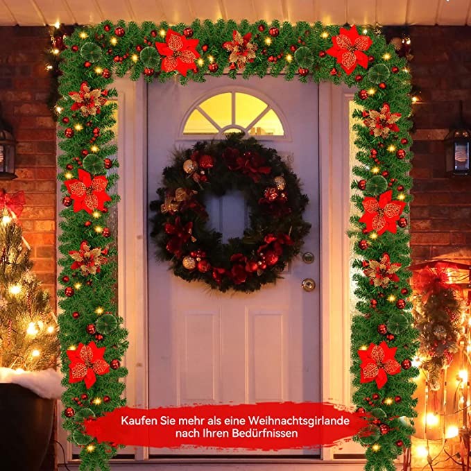 SHAVINGFUN Christmas garland,christmas garland with lights,2.7M/ 9FT Christmas Garland Decorations Illuminated with LED Lights,for Stairs Fireplaces Christmas Festive Wreath Xmas Decor